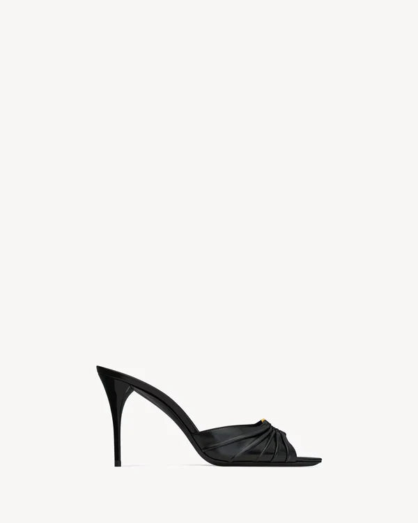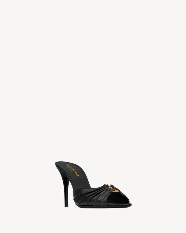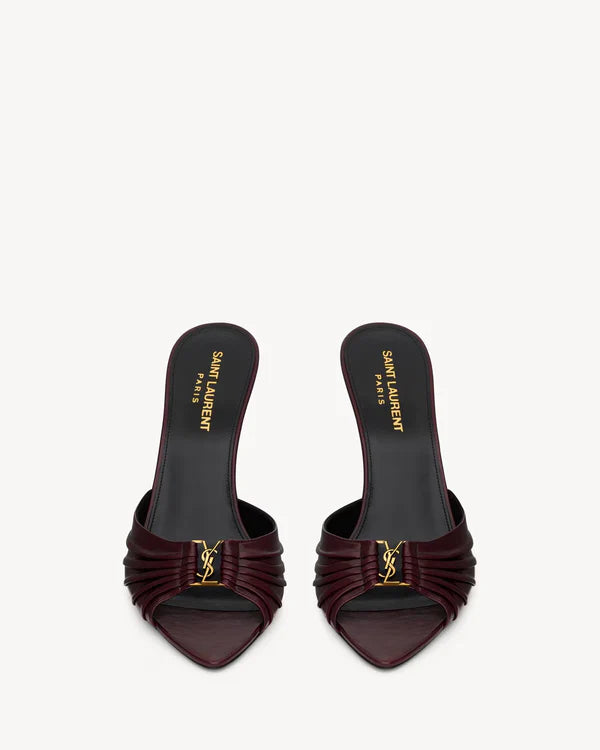 Sculpted slip-on mules in rich bordeaux leather with a pleated bow vamp and a gold-tone plaque at the center. The pointed open toe and slim high heel elongate the leg, while the smooth leather lining and lightly cushioned footbed keep them comfortable from dinner to after-hours. A refined, statement pair that elevates denim, tailoring, or a silk dress alike.